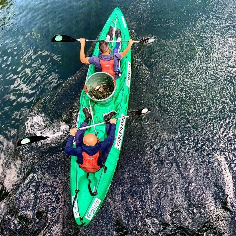 Two people collect trash along a river with GreenKayak, an environmental NGO that engages people in the fight for cleaner oceans across Europe.